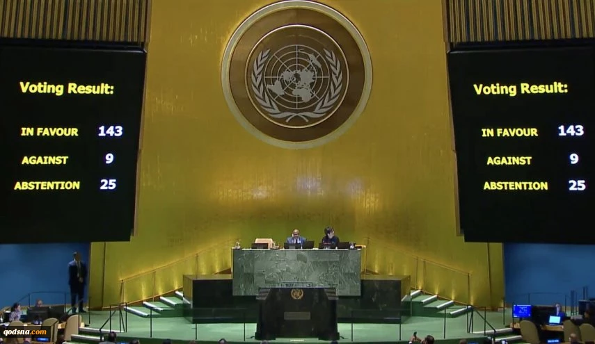 به گزارش خبرگزاری قدس (قدسنا) پیش نویس قطعنامه مجمع عمومی سازمان ملل درباره عضویت کامل فلسطین در سازمان ملل با ۱۴۳ رای موافق، ۹ رای مخالف و ۲۵ رای ممتنع به تصویب رسید.