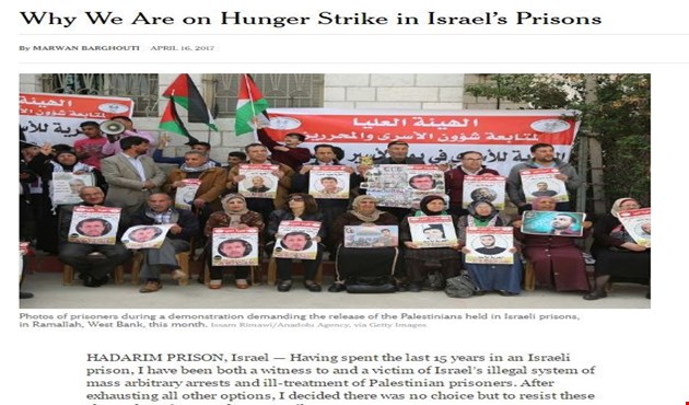 «مروان البرغوثی» اسیر فلسطینی که از امروز اعتصاب غذای خود را در زندانهای رژیم صهیونیستی با مشارکت قریب به 1500 اسیر دیگر، آغاز کرده در مقالهای که در نیویورک تایمز منتشر شده از اقدامات اشغالگران صهیونیست علیه اسرا به شدت انتقاد کرد.