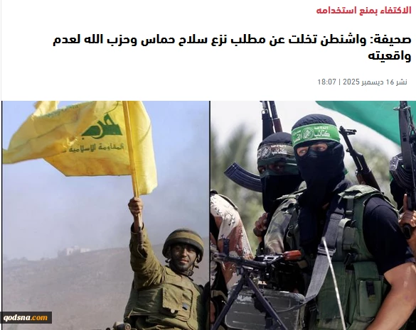 تصنیف : تقرير: واشنطن تتخلى عن نزع سلاح حماس وحزب الله ضمن رؤية إقليمية 2 الثلثاء 25 جمادي الثانية 1447 ساعة 20:03