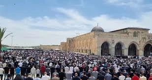 Tens of thousands of Palestinians perform Friday prayer at the Aqsa Mosque