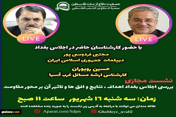 به گزارش گروه سیاسی خبرگزاری قدس (قدسنا) امروز سه شنبه 16 شهریورماه نشست مجازی «بررسی اجلاس بغداد اهداف، نتایج و افق ها و تاثیر آن بر محور مقاومت» با حضور «مجتبی فردوسی پور» دیپلمات جمهوری اسلامی ایران و «حسین رویوران» کارشناس ارشد مسائل غرب آسیا در ساختمان جمعیت دفاع از ملت فلسطین برگزار خواهد شد.