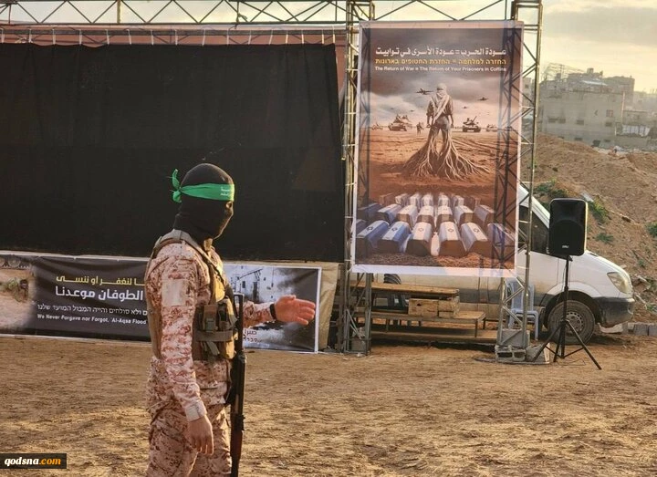 به گزارش رسانه های صهیونیست، در پوستر امروز حماس در محل تحویل اجساد نوشته شده است: بازگشت جنگ مساوی بازگشت اسرای شما به تابوت.