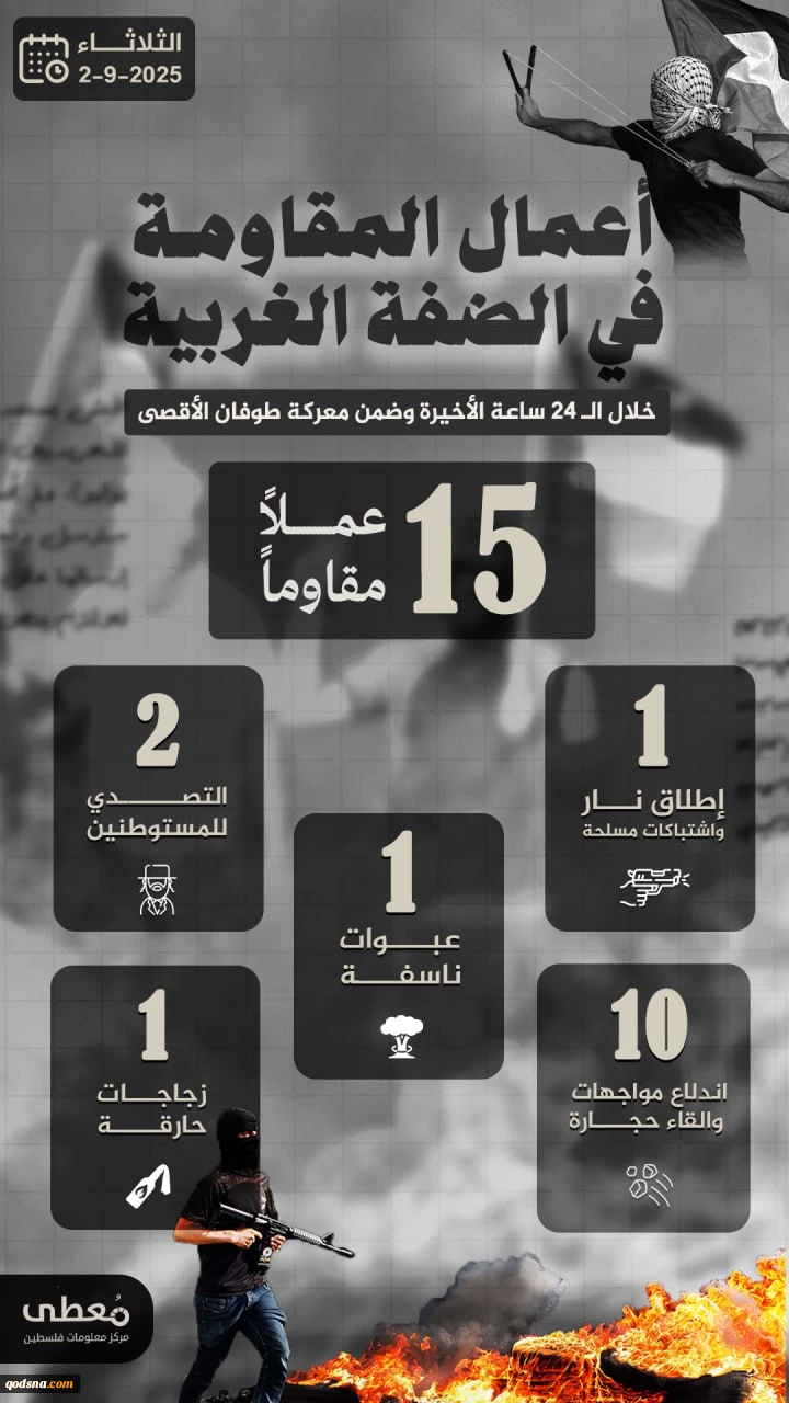 امتیاز دهید : مرکز پژوهشی معطی منتشر کرد؛ 15 عملیات مقاومتی در کرانه باختری در 24 ساعت اخیر+ نمودار 2 چهارشنبه 12 شهریور 1404 ساعت 14:19