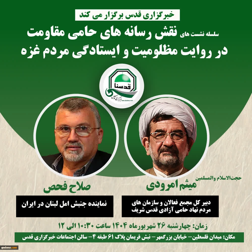 امتیاز دهید : خبرگزاری قدس فردا برگزار می کند: سلسله نشست تخصصی «نقش رسانه های حامی مقاومت در روایت مظلومیت و ایستادگی مردم غزه» 2 سهشنبه 25 شهریور 1404 ساعت 8:11