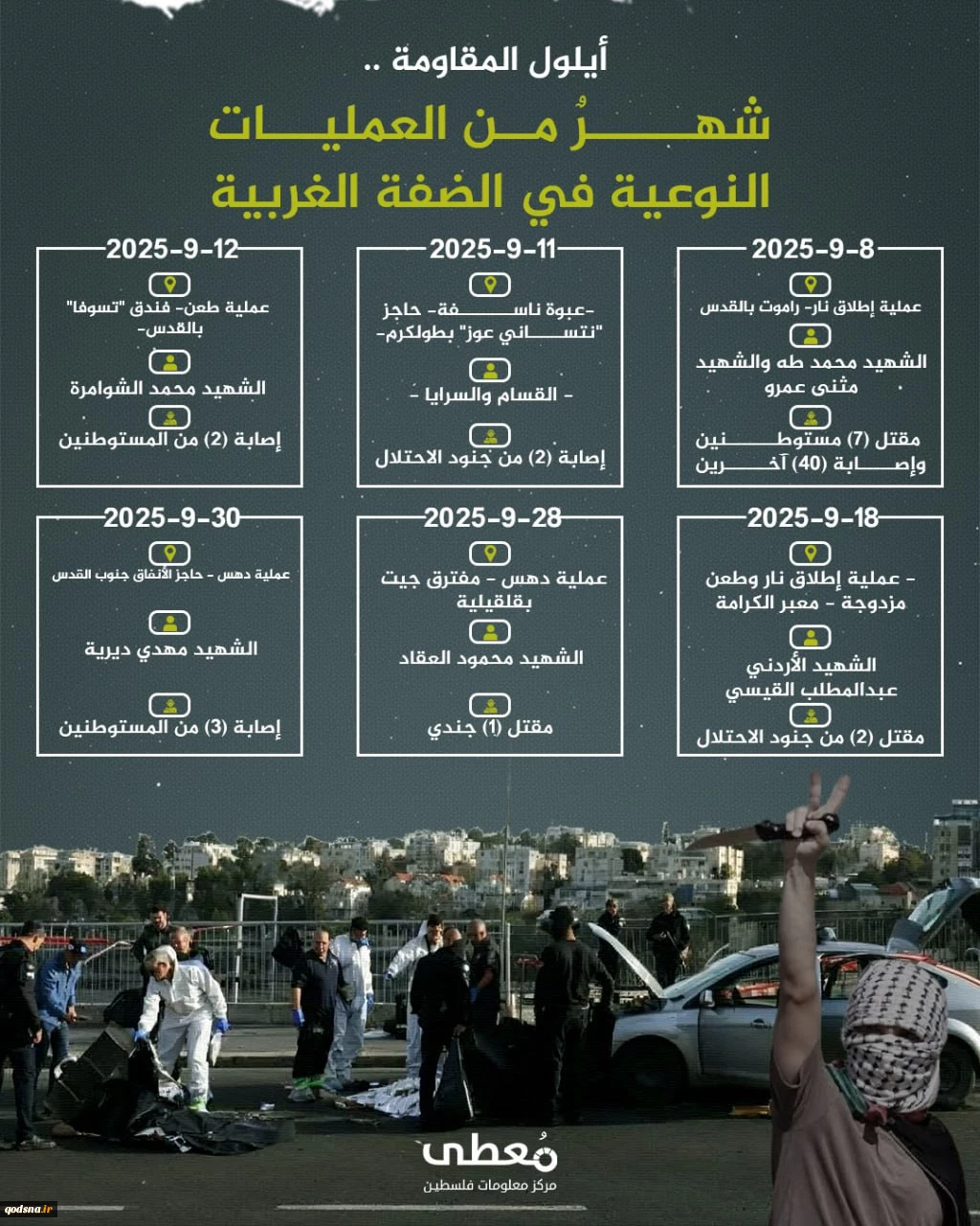 امتیاز دهید : سپتامبر درخشان مقاومت در کرانه باختری؛ 6 عملیات بزرگ با هلاکت 10 صهیونیست+ نمودار 3 دوشنبه 14 مهر 1404 ساعت 11:50