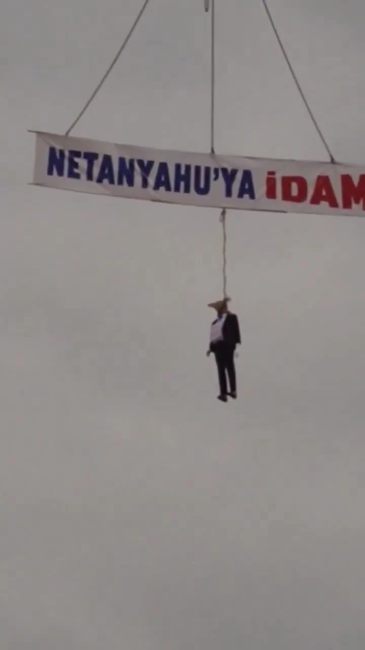 نصب بنری با نوشته «اعدام نتانیاهو» و ماکتی از نخست‌وزیر رژیم صیونیستی بر روی جرثقیل در ترکیه