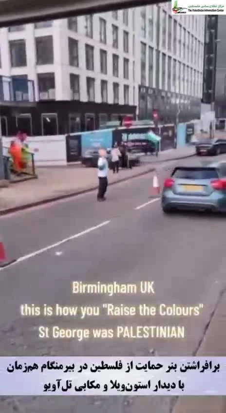 برافراشتن بنر حمایت از فلسطین در بیرمنگام هم‌زمان با دیدار استون‌ویلا و مکابی تل‌آویو